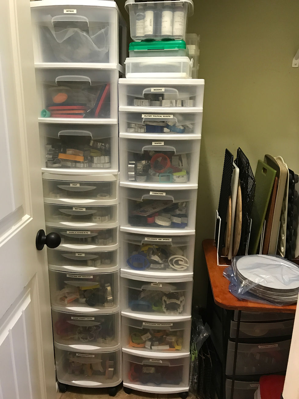 Back in the day when I had a couple dozen cutters, I kept them neatly tucked in a snap top craft box. I enjoyed the sound the cutters produced when I was pillaging the box looking for the one that I needed at the moment. Weeks turned into months and months turned into hundreds of cookie cutters. It became a lengthy process to just locate the one I needed. I didn't have time to go through hundreds every time I needed one. I bought this house for the few square feet that comprised two unspecified pantries in my kitchen. One holds my baking utensils (pictured above) and the other one holds baking ingredients (flour, sugar, powdered sugar and the like).